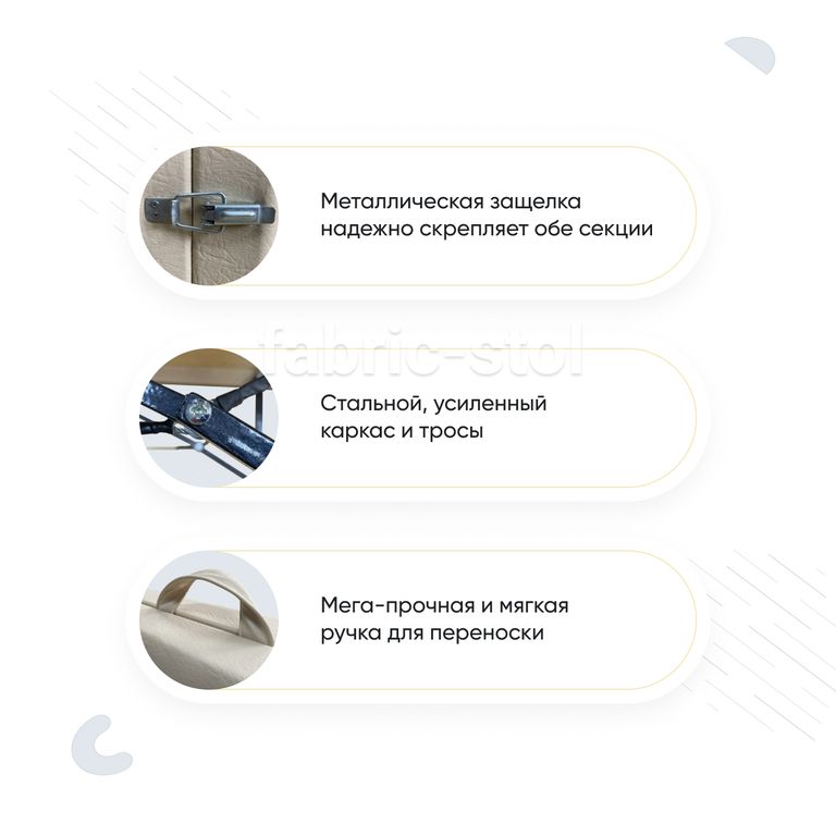 Легко складывается в чемоданчик, что очень удобно при транспортировке или хранения дома. Ручка сделана специально так, чтобы удобно было носить кушетку с собой. Закрывается кушетка на защелку, что позволяет плотно фиксировать ее, чтобы она не открылась при переноски. Также снизу есть специальные ножки, чтобы кожа не поцарапалсь и ничего с ней не случилось.